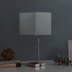 Modern Ashton Square Table lamp feature a Wireless Charging Pad with Qi Technology and a USB port for convenient charging. With Qi integrated into many smartphones, charging is easier than everโno charging blocks or cords required. Design a workspace or reading nook thatโs primed for productivity, you can charge up without cords or clutter. An elegant & practical solution: This lamp does not have the glare of overhead lights or exposed bulbs as its neutral linen shade softens the light giving your room a warm ambient glow. The unique modern style and size of this lamp makes it the perfect bedside table, office lamp, or living room side table lamp. Contemporary design and features a metal construction with a top w/ a Blue Green Textured Square Drum shade. Convenient Pull Chain: With the stylish pull chain, you can turn ON/OFF with the pull chain. No need to find the switch on the cord when you are going to sleep. Super convenient for your bedroom. The charging port and pad function regardless of whether the lamp is on or off. Add this table lamps to your bedroom, office or living room for a dash of delightful symmetry and visual allure.