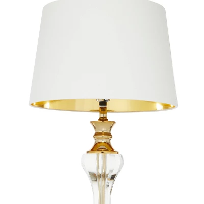 Sparkling in classic, glam inspired style, this faux crystal table lamp features an hourglass silhouette with shiny finishes throughout. The transparent faux crystal and metallic gold metal stem beautifully shine, further highlighted by the ambient glow from the metallic copper interior shade. The exterior of the cylinder drum lamp shade is a bright white with a soft sheen. This stylishly elegant lamp’s versatile hues and finishes work with any color palette and pattern and bring a bright pop of light and shimmer to any tabletop!. Uses one standard E26 light bulb (not included). This crystal table lamp has a 63″ cord length. Suitable for indoor use only. This glass table lamp is topped with a fabric drum shade. This table lamp powers via an on/off switch. This item comes shipped in one carton.