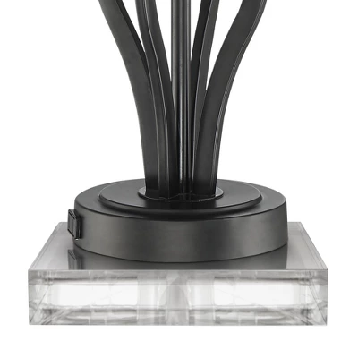 Edgy design elements combine to offer a fresh look in this set of two metal accent table lamps. From 360 Lighting, this pair reflects an exotic dark metal body and base and a contrasting glass shade. Twin pull chain switches and a USB port on each base rounds out a host of fabulous features. Each lamp has a 8″ square riser.