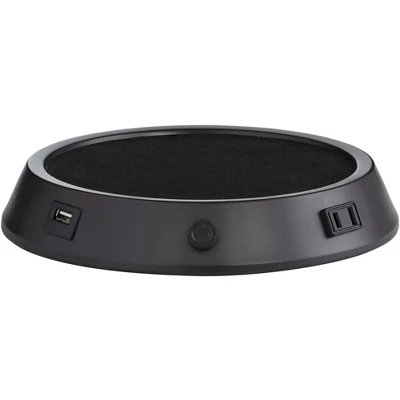 Get contemporary with this beautiful table lamp design. The droplet body is impressive with a bronze finish and fluid lines. The striking drum shade looks crisp and clean and contributes to the vertical interest of this modern design. This table lamp comes with a bronze universal charging station at the bottom, which can be removed and used with other lamps. The charging station has a built-in USB ports and two 2-prong outlets, allowing you to charge up to three devices at a time. The back outlet is controlled by a full range dimmer switch.