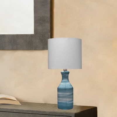 A serene choice for any room in your home. Handmade by artisans of ceramic, the base features swirls of color in a soft palette that vary from piece to piece, making this tabletop lamp your own one-of-a-kind piece of art. Topped with a crisp linen drum shade with a rolled edge for tailored definition. Itβs a bright and airy accent for any nightstand, console or desk.