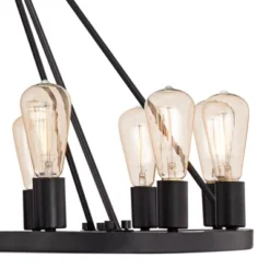 A rustic gray wood finish outlines a black finish openwork circle frame design in this semi-flushmount ceiling light. From Franklin Iron Works™, the handsome fixture is an easy way to complement transitional style decorating or update more rustic decor. It features three vintage style Edison bulbs with decorative filament for added flair.
