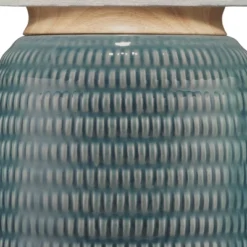 Add a comforting glow to any space in your home with this tabletop lamp. Beautifully crafted by artisans of ceramic, its base features a patterned surface covered in a rich vibrant reactive glaze, wood accent and is topped with a smooth linen shade. Whether youâre brightening up your reading nook, bedroom or adding fresh light to your living room, this lamp is sure to provide the warm light you desire.
