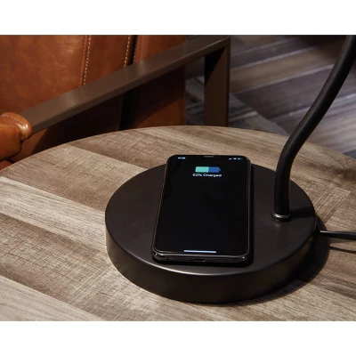 Donβt let lighting throw you for a loop. The beautiful curve of this lamp will add the right contour to your space. With a classic black finish, the arc of this lamp ends with an adjustable metal shade. The integrated wireless charging and USB port add a convenient way to keep your devices powered. Black finished desk lamp. Metal shade. Adjustable neck. (1) Wireless charger and (1) USB charging port. On/off switch. (1) E26 socket, type G bulb recommended – 40 watts max or 8 watts max CFL. Matching floor lamp -L206001. Signature Design by Ashley is a registered trademark of Ashley Furniture Industries, Inc.