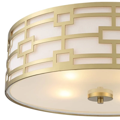 This charming modern flushmount ceiling light creates a look that will upgrade any hallway or room. The painted gold finish on the open decorative pattern work adds a luxurious touch, while the fabric shade and glass diffuser add a more casual feel to blend in with a variety of existing decor styles. Use this piece to add a simple, yet refined upgrade.